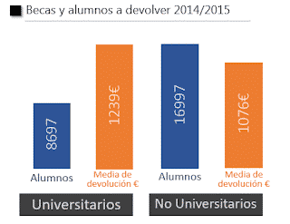 De los 550.000 becados, un total de 25.694 alumnos tendrán que devolver la beca. Esto supone 1 de cada 20 alumnos aproximadamente, el 5% del total, de los que 11.171 ya la han devuelto por un importe total de 12.7 millones de euros. Es decir, 1137€ por alumno de media.