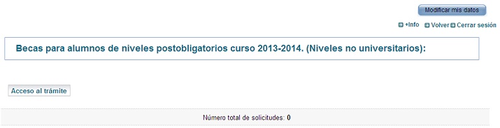 En esta página se indica la cantidad de solicitudes que habéis enviado, así como la beca que estáis presentado ( el nivel) y la pestaña de «acceso al trámite». En esta página, en un futuro, veréis muchos más datos y el desarrollo de vuestra beca, de aquí a unos meses.(ver punto 10). La primera vez que accedes no hay nada.