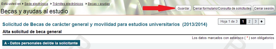 Como podéis ver, podéis ir consultando las 3 hojas que tiene tu solicitud de beca sin perjuicio de lo que esté puesto en ninguna otra. Eso si, antes de cambiar de página te aconsejamos de nuevo guardar la solicitud.
