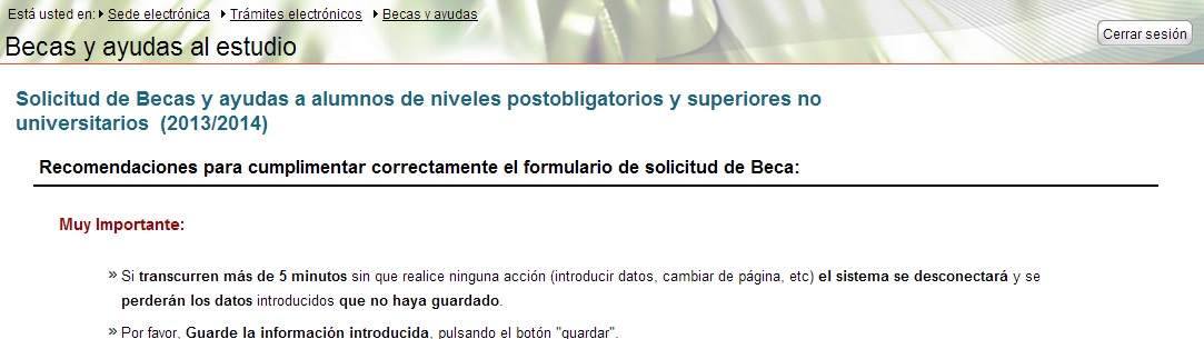 Muy importante es indicar que si estáis más de 5 minutos sin tocar vuestra beca sin guardar nada los datos se borraran por seguridad por lo que se recomiendo encarecidamente que vayáis guardando el borrador de beca cada minuto.