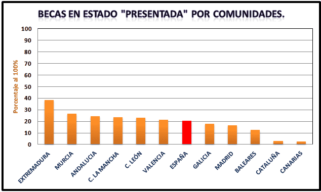 En el otro lado de la balanza se encuentran Cataluña y Canarias con el 5% de becas en presentada, es decir, casi todas han comenzado a tramitarse, sin embargo se ha de señalar que en estos casos las becas se llevan por otros organismo que, si bien están en coordinación con el MECD, hacen que el sistema sea un poco más lento, pero no mucho, y quizás es por ello la mayor rapidez para empezar a tramitarlas.