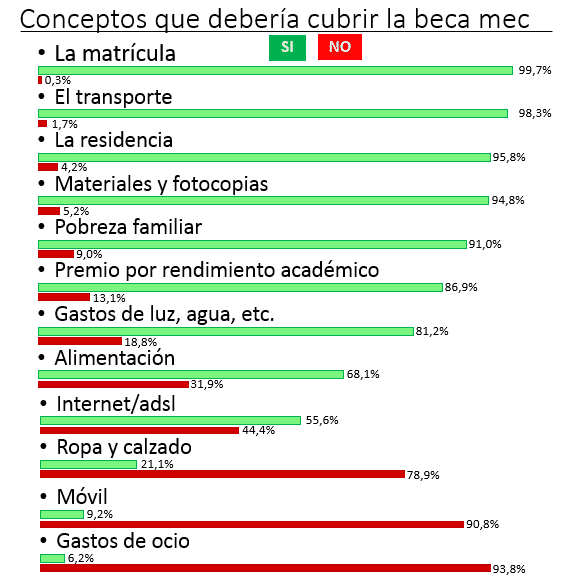 Ordenamos de mayor a menor, indicando el porcentaje de apoyo, de los conceptos que sí debería cubrir la beca mec.