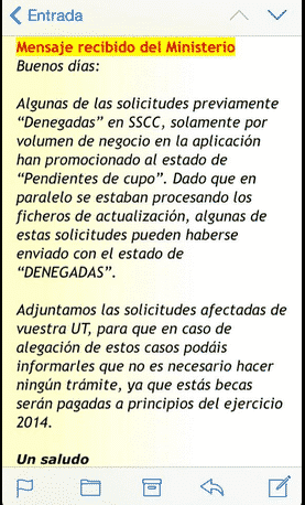 Tal y cómo vimos por Twitter, el MECD ha enviado a las unidades de becas un email con la información de que no hace falta que tramiten las alegaciones de las becas denegadas por volumen de negocio, entre otras, porque ha sido un fallo masivo de denegaciones por un cruce de datos en la base de datos y se está subsanando automáticamente, proponiéndolas para concesión.