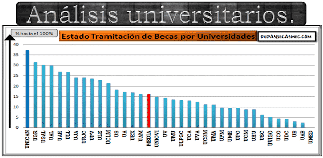 Estado de trámites por universidades hacia el 100% del proceso completado. Cuando se llegue al 100% es que todas sus becas han sido resueltas y abonadas. Se elaborado con una fórmula matemática que asigna puntos a los estados.