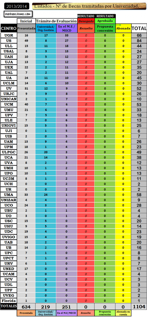 Siempre hay que tener en cuenta que el estado de la sede electrónica va con diez días de retraso de media. Las más atrasadas con la USC, UVIGO, UCO y la UDC. Mención aparte merece la UNED con ninguna de las 16 becas que tenemos en el listado comenzadas a tramitar.