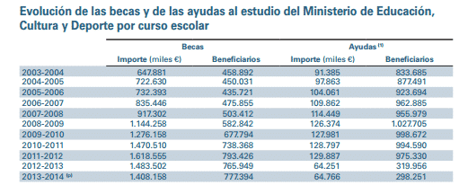 Comienzan los rectores: la Conferencia de Rectores de las Universidades Españolas (CRUE) comunicaba el pasado jueves una nota donde se exponía que los alumnos universitarios reciben un 10% menos de beca desde el curso pasado. Incluyen un gráfico donde se expone el importe total destinado a beca y el que se llevan los univesitarios, sacado del documento Datos y Cifras del sistema universitarios/2014 del Mecd.