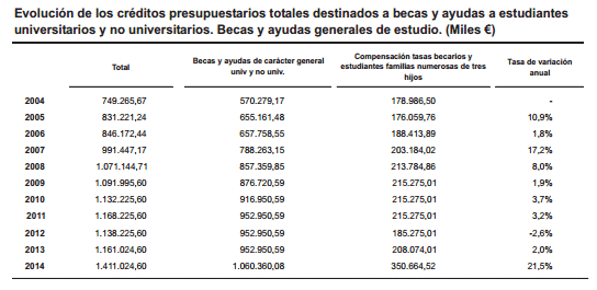 El gráfico de la discordia. Si añadimos un año más,, veremos que ese presupuesto ha aumentado un 2 millones de €, un 0,14% y que suponen los llamados presupuestos de becas «más altos de la historia»