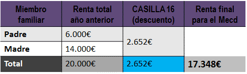 En este caso el descuento se hace una vez pues las dos rentas se juntan en una misma declaración. El descuento además es el mínimo, de 2652€, por pasar entre los dos de 13260€. Entonces, la renta que el contará el mecd es de 17.348€, más de 4000€ por encima que el anterior caso y solo por hacer la declaración conjunta. Esto haría que la familia se pasara del umbral 1 al 2 y al alumno no le dieran los 1500€ por estar debajo del umbral 1, además de bajarle la parte variable.