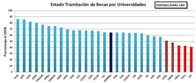 Hay algunas Universidad en la cuerda floja, como la USAL y la UNED, que tienen el avance de becas en un 50%, mientras que hay 3 que están especialmente graves, como son la UMA , UHU y UJI, con cerca del 40% de consecución, 20 puntos por debajo de la media nacional y algo que deben solucionar rápidamente.
