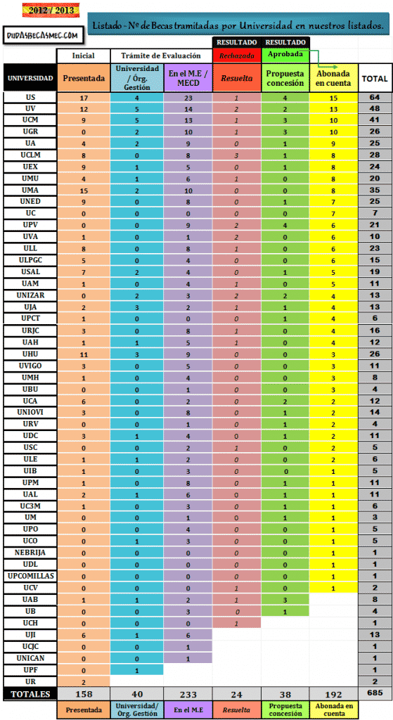 Todos esos datos siempre están referidos a nuestras listas de seguimiento de becas universitarias , de las que ya forman parte más de 685 personas. No podemos seguir las de FP ni de bachillerato en este aspecto ya que la enorme cantidad de centros hace imposible su regulación: