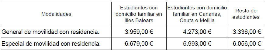 Como decimos, este año no han subido nada los importes, y tomaremos como referencia algunos generales para ejemplificarlo. Este es el caso de las becas generales y especiales de movilidad con residencia, las más cuantiosas. Los importes: