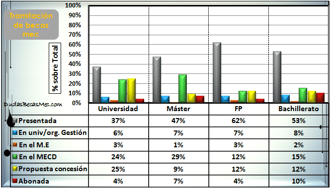Os mostramos el gráfico actual de la situación en la que se encuentra la tramitación de las becas mec por nivel educativo: