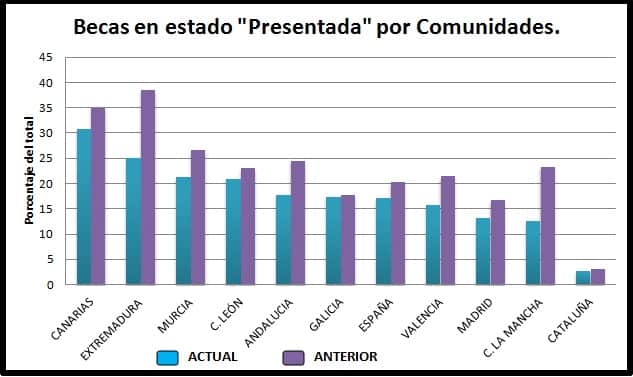 España tiene esta media total, el 17% de becas presentadas, y por debajo de esa media se encuentran 4 comunidades. La de Valencia, con el 16%, la de Madrid, (la más numerosa junto a la Andaluza) y Castilla la Mancha con un 13% de becas presentadas, un logro de la administración donde la mayoría son por una falta de coordinación de departamentos.