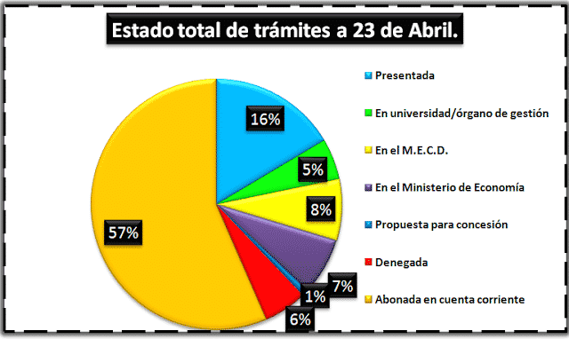 Poco a poco se espera que para el mes de Mayo las becas ingresadas y resueltas alcancen el 80%,(ahora en el 63%) algo muy destacable y más aceptable teniendo en cuenta la mala eficiencia del MECD.