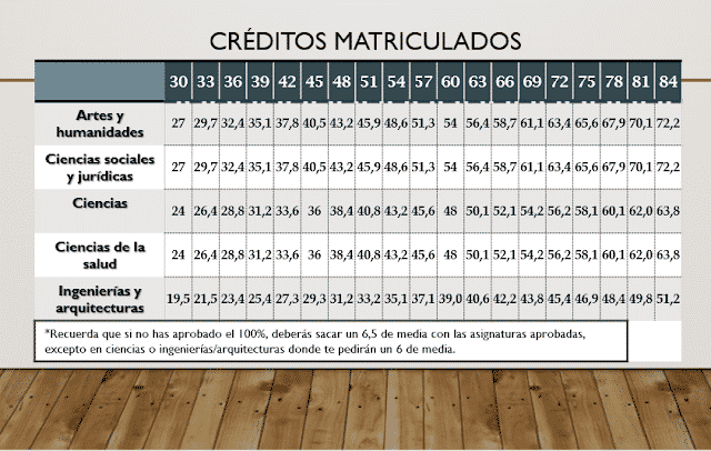 ► La tabla funciona de tal forma que, a partir de 60 créditos matriculados, cada 6 créditos más extra matriculados, el requisito académico que le piden al alumno baja en un 1% (0,5% si son 3 créditos más). De esta forma, a un alumno de artes, que le piden un 90%, si se matricula de 66 créditos le piden un 89%, de 72 créditos un 88% y así sucesivamente.